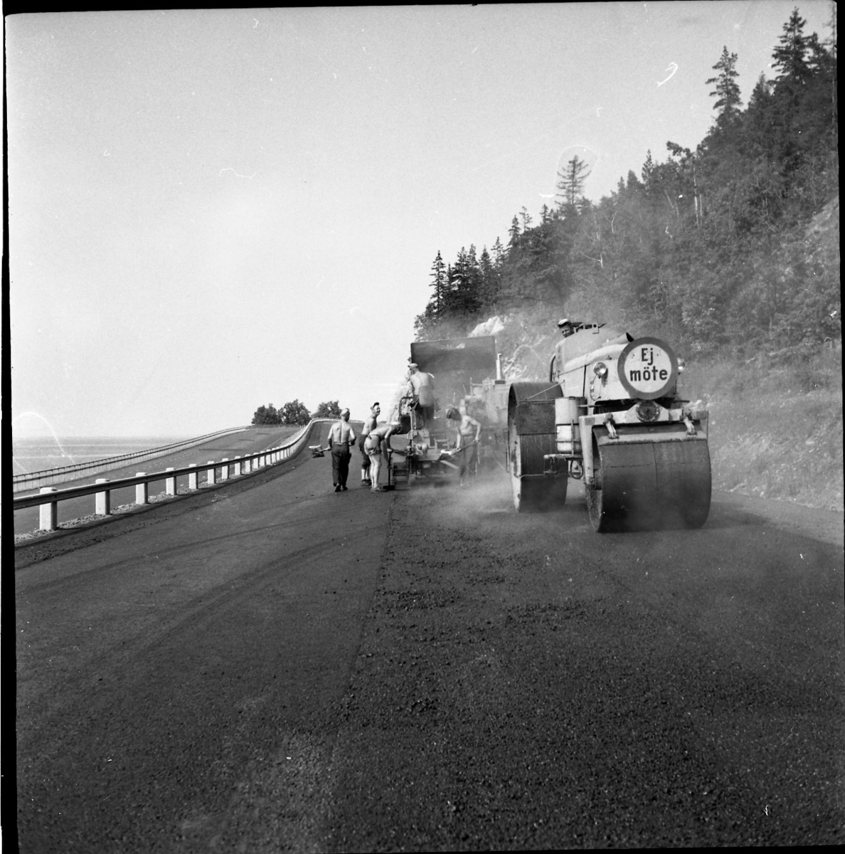 En ångvält kör över nyligen utlagd asfalt. Flera arbetare med bar överkropp går bakom och rakar ut asfalt.