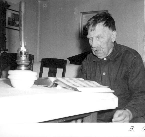 En gammal man, Karl Alfred Johansson Rehn i Sonaby, sitter vid ett bord med en tänd fotogenlampa och uppslagen bok framför sig.