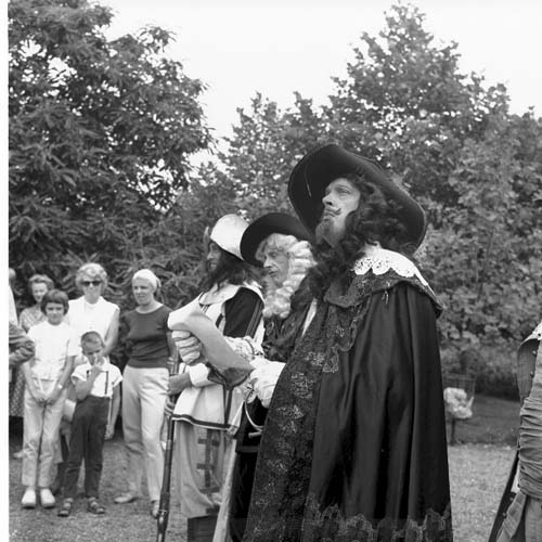 Tre skådespelare står framför sin publik som skymtar i bakgrunden. Skådespelarna har långt lockigt hår, terspetshattar och hattar med uppvikt brätte.