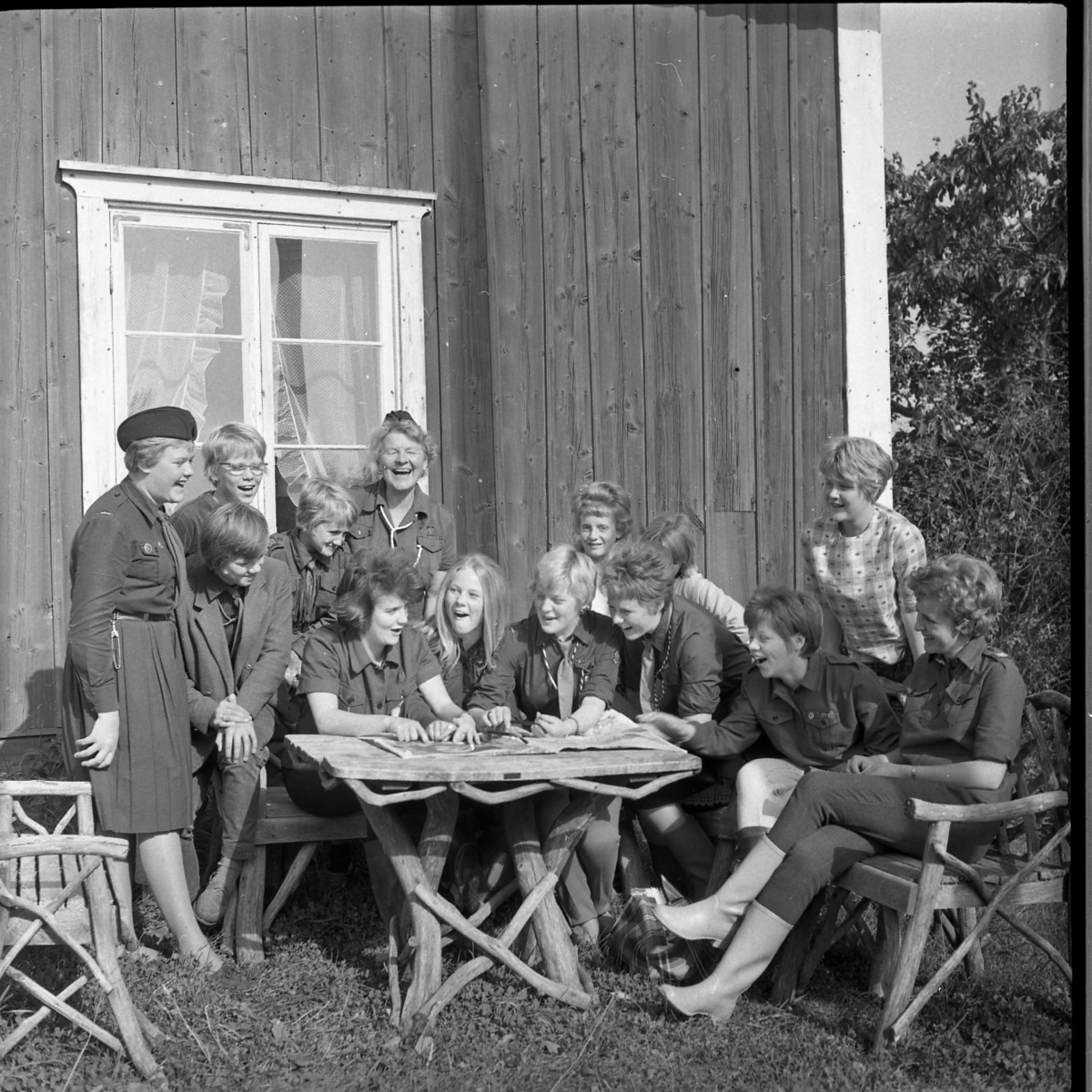Några unga kvinnor sitter och står samlade runt ett bord. På bordet ligger en uppslagen tiding. De tittar på varandra och skrattar.