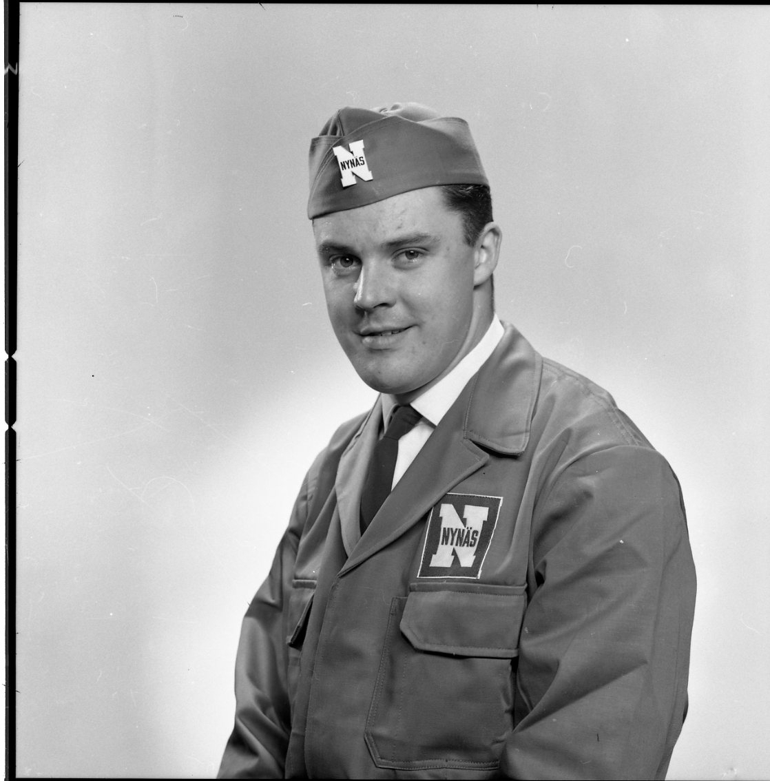 En ung man i Nynäs-uniform, personal vid Nynäs bensinstation i Gränna.