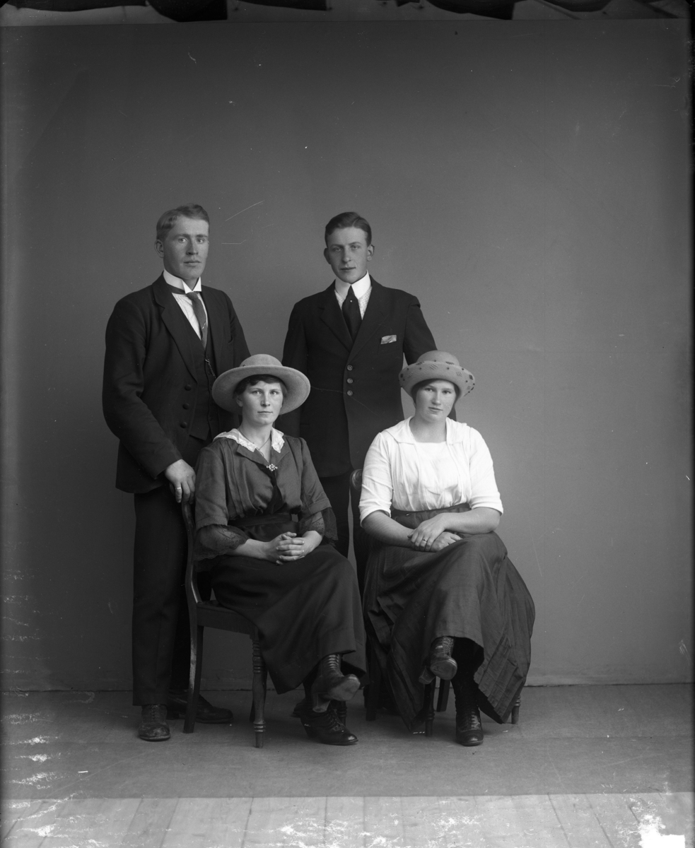 Två män står bakom två sittande kvinnor med hattar. En av männen är Ivar Ernst från "Elmberg, Vireda".