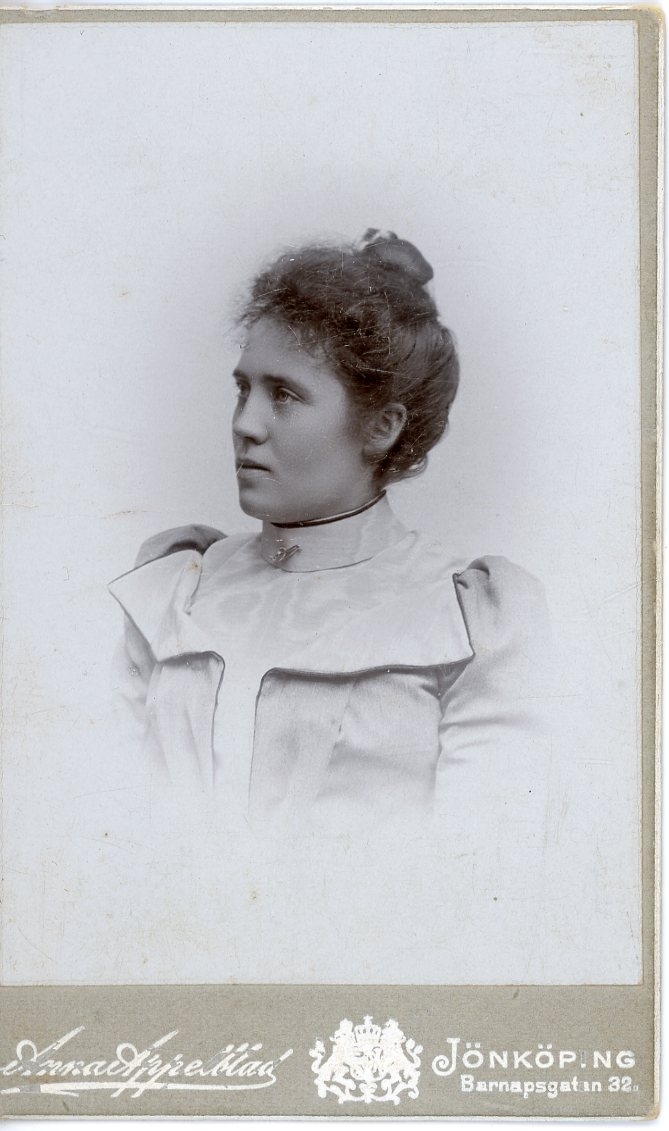 Kabinettsfotografi: en okänd ung kvinna med håret uppsatt i en knut.