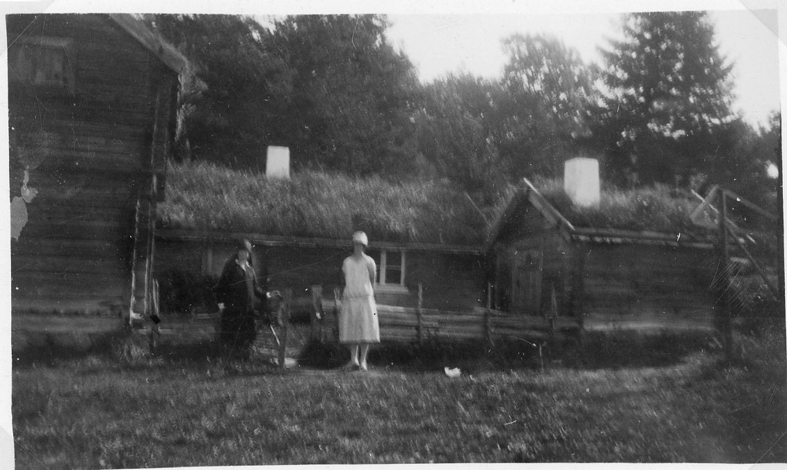 Två kvinnor, en äldre i mörkt och en yngre i ljust, står framför pappersmakarebostället på Grännaberget. Den utgörs av en liten stuga samt två ekonomibyggnader, alla knuttimrade och med torvtak