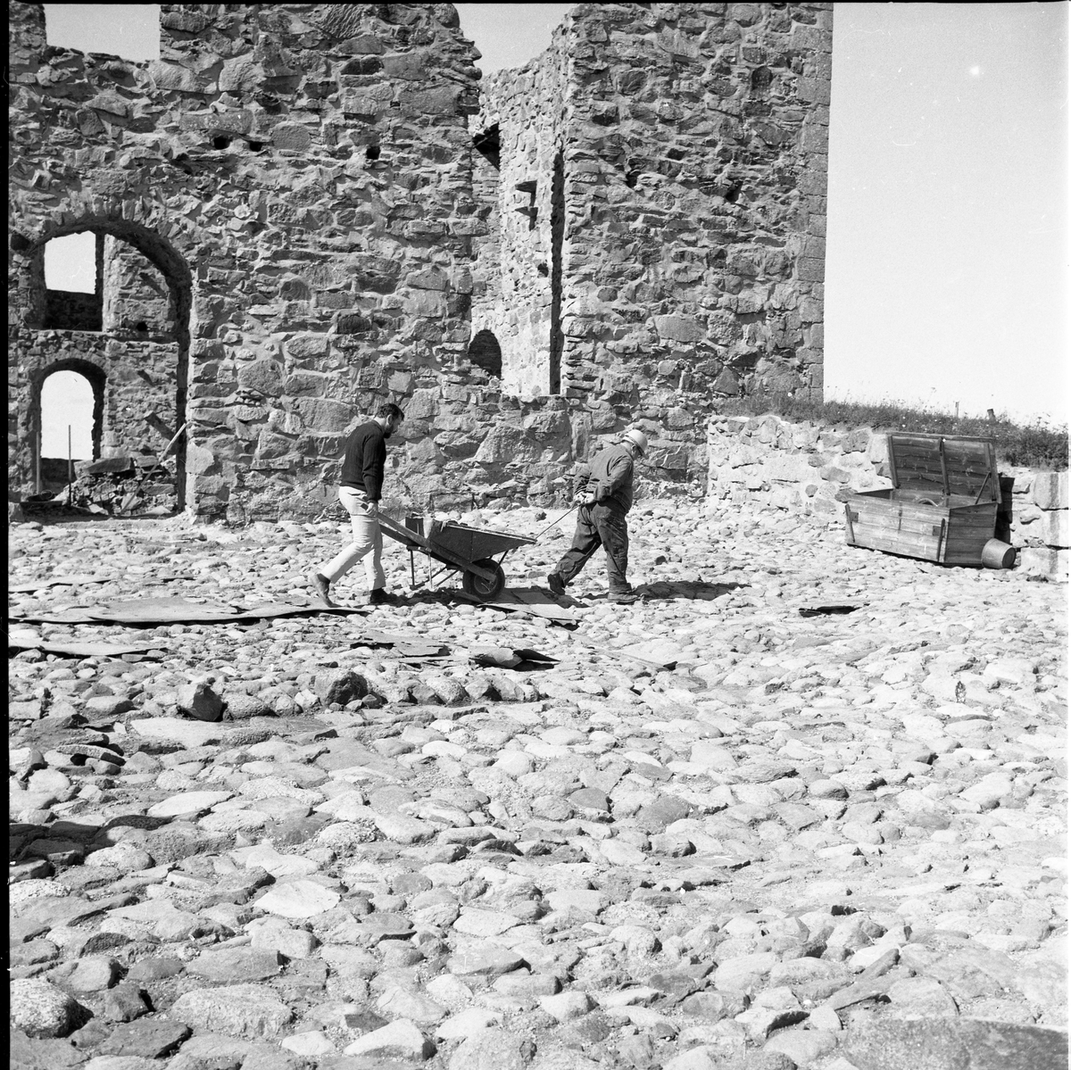 Två män går med en skottkärra över Brahehus slottsruins borggård.