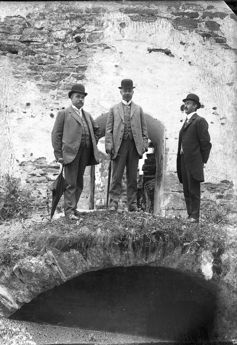 Tre män med kubb och hopfällda paraplyer står på Visingsborgs slotts inre borggård. Det är sommar.