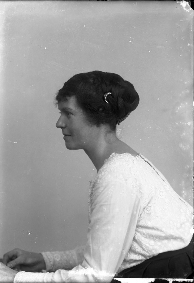 Porträtt av en kvinna i profil. Hon sitter lite framåtlutad.