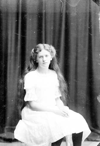 Porträtt av en sittande flicka med långt hår i en ljus klänning.