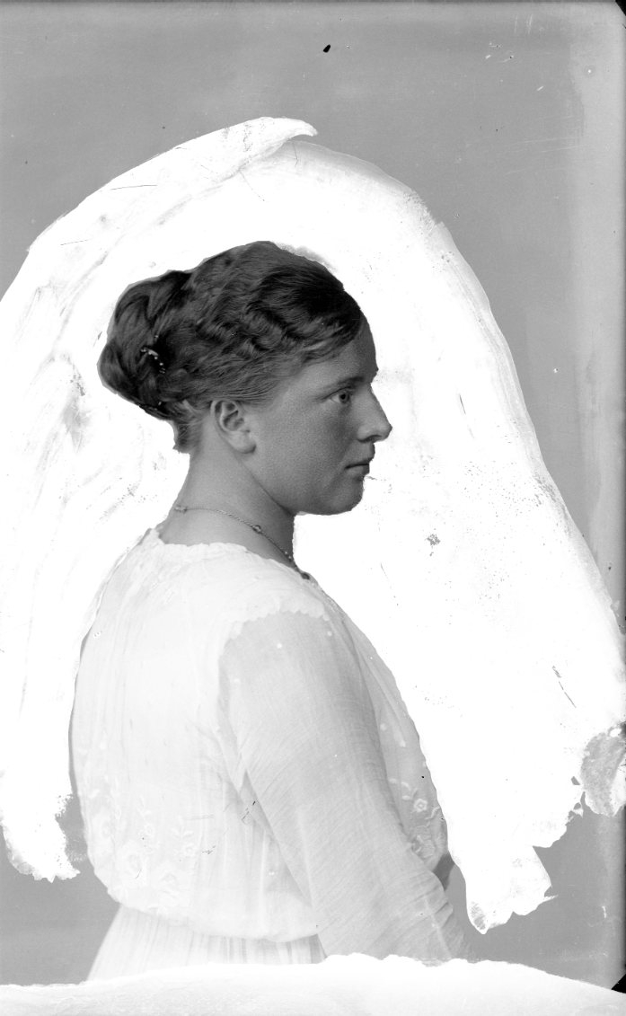 Bröstbild av en ung kvinna med vitt livstycke. I profil, med retuscherad bakgrund.