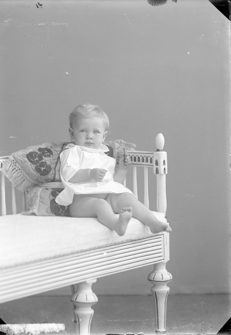 Ett spädbarn - en flicka - med bar underkropp sitter i en soffa. Hon håller en leksak i vänster hand.