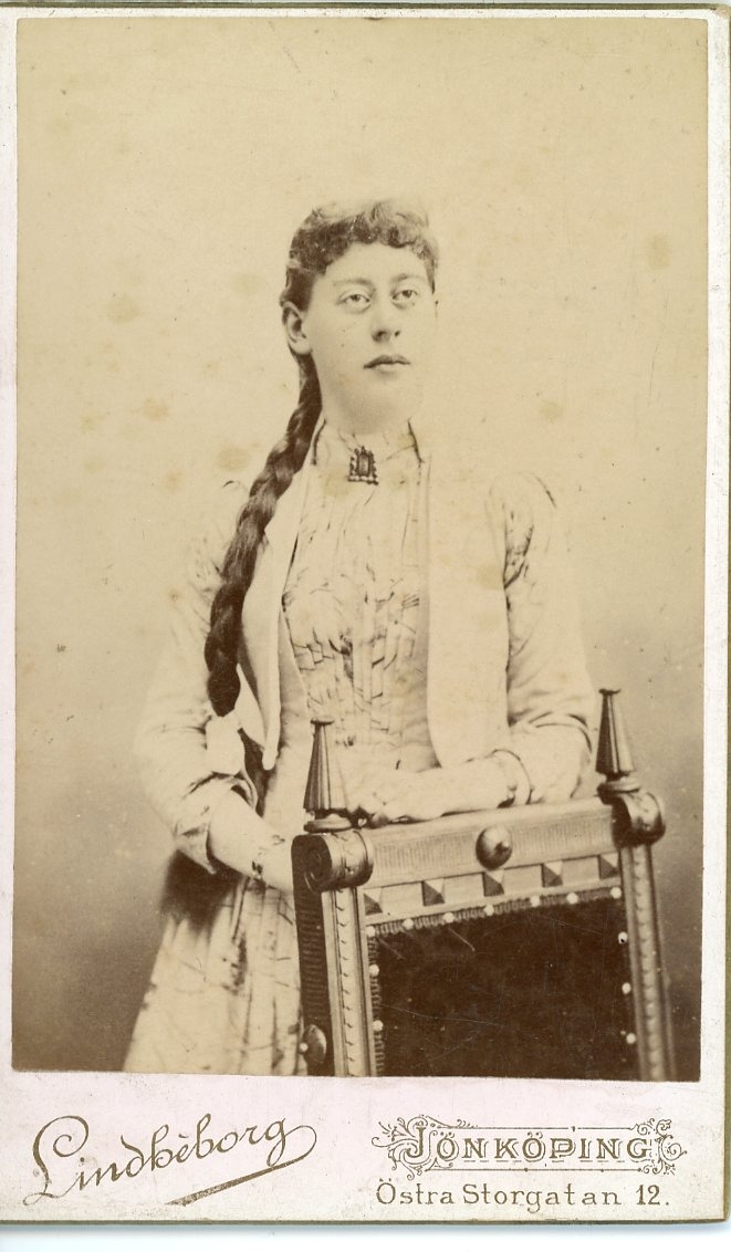 Kabinettsfotografi av en okänd ung kvinna med en midjelång fläta. Hon står vid en stol.
