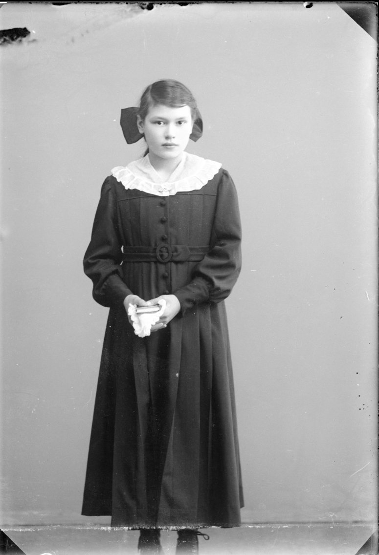 Porträtt av en flicka i tonåren, sannolikt konfirmation, i mörk klänning med vit spetskrage. Hon står med en liten bok och näsduk i händerna.