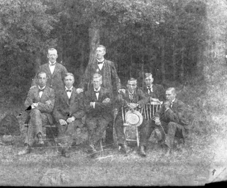 Åtta män, stående och sittande på stolar på en gräsplan.