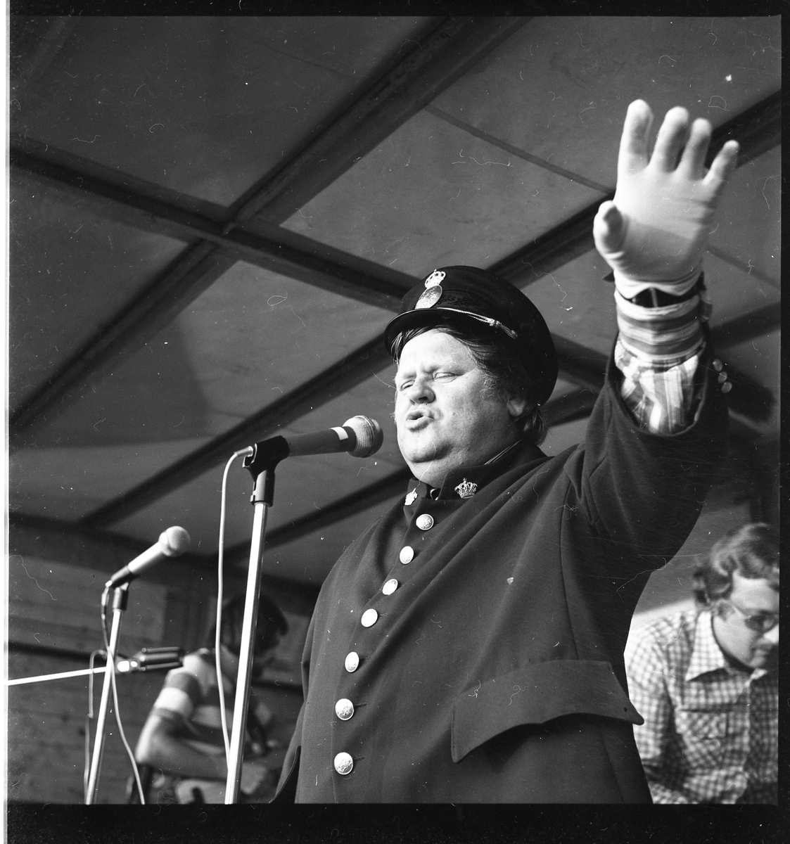 En man i uniform, skärmmössa och vita handskar gestikulerar och sjunger på en scen.