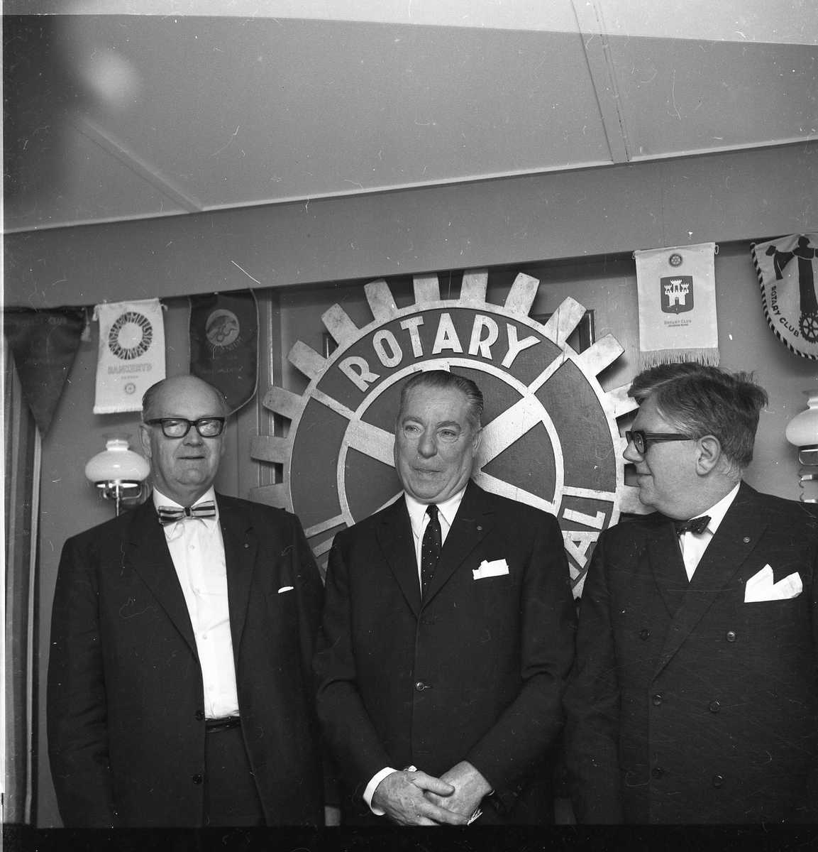Tre män framför en stor Rotary-logo.