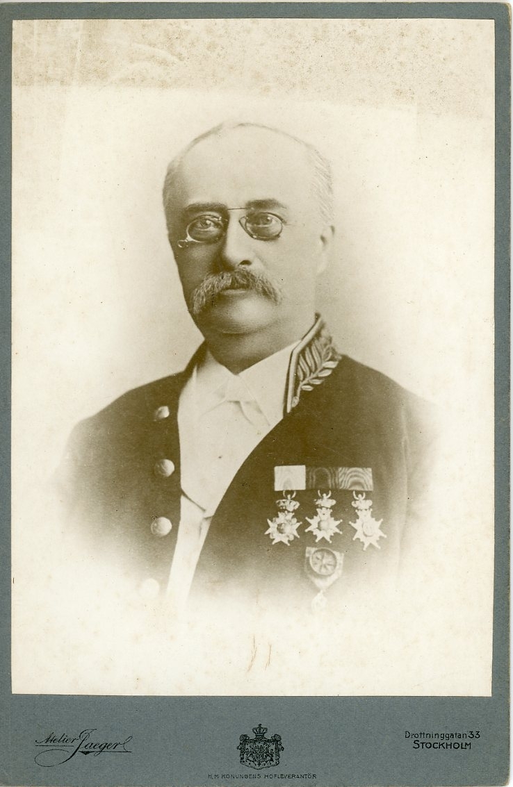 Kabinettsfotografi av en okänd man med glasögon och mustasch. Han bär en ämbetsuniform med ordnar på bröstet.