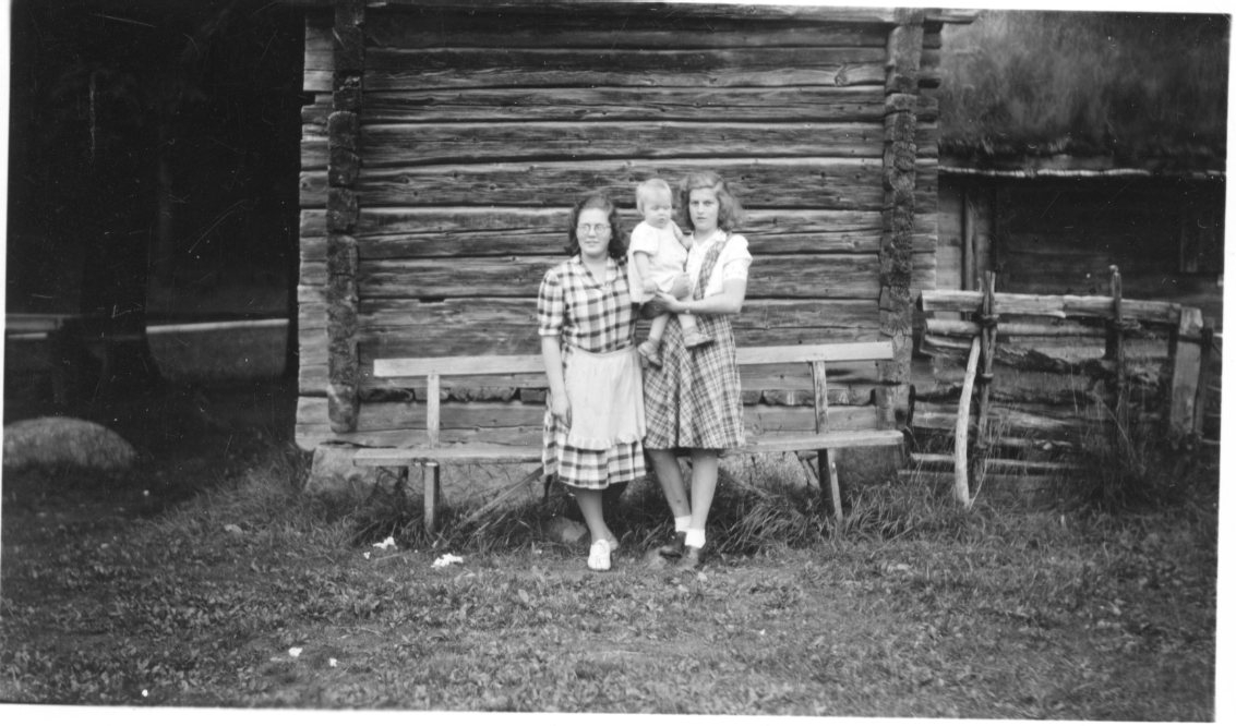 Två kvinnor står vid en bänk framför Pappersmakarebostället på Grännaberget. Den ena kvinna håller ett litet barn i famnen.