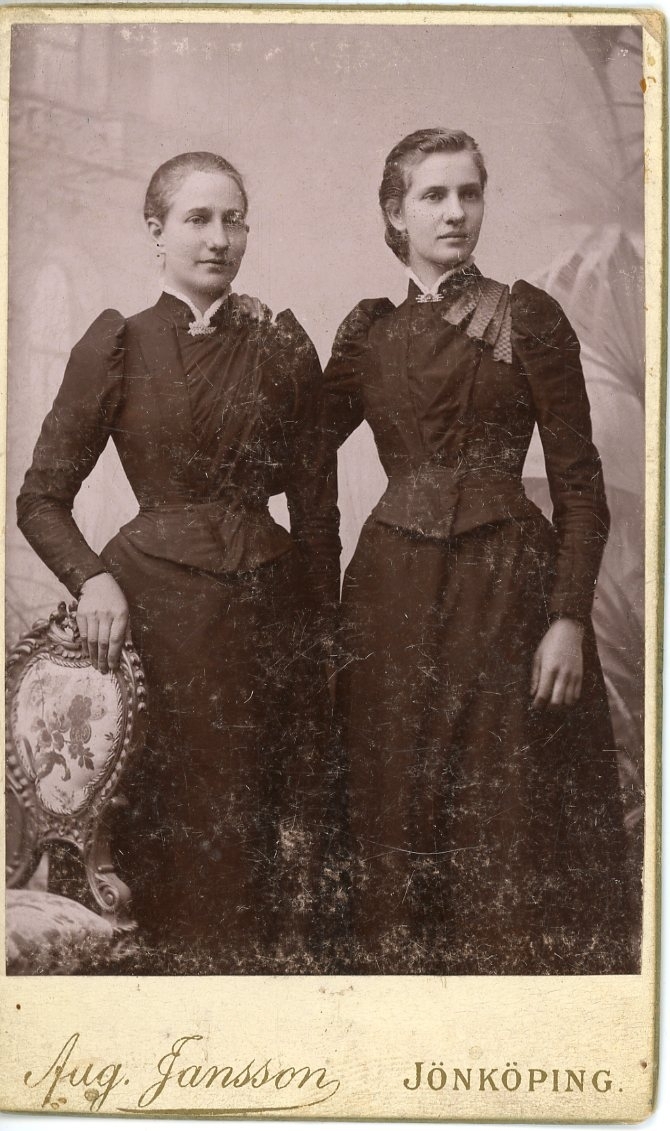 Kabinettsfotografi: två okända unga kvinnor i mörk dräkt. Den ena kvinna håller sin arm bakom den andra kvinnan.