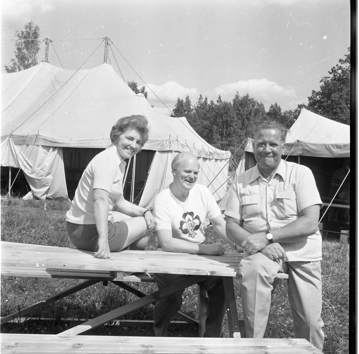 En kvinna och två män sitter vid en utemöbel på en gräsplan framför ett stort tält.