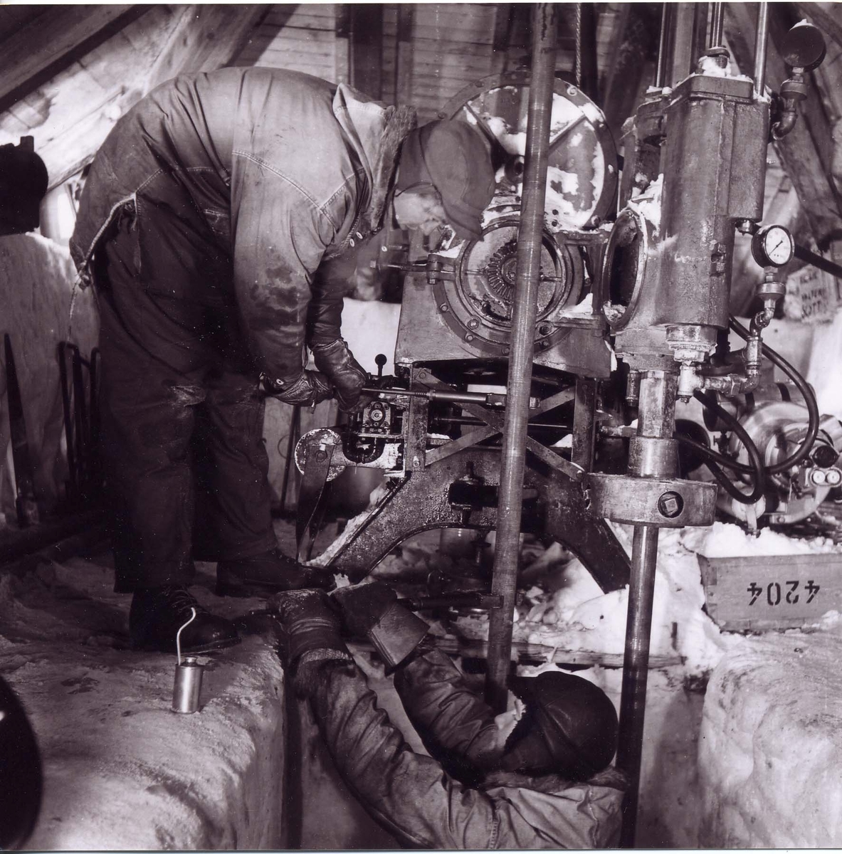 "Borrmaskin i borrhytta. Valter Schytt och Charles Swithinbank i gropen." Man tar upp isborrkärnor.