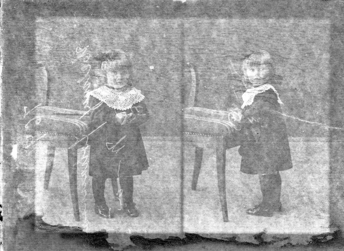 Två porträtt av en liten flicka på samma glasplåt. Hon har spetskrage och står vid en stol.