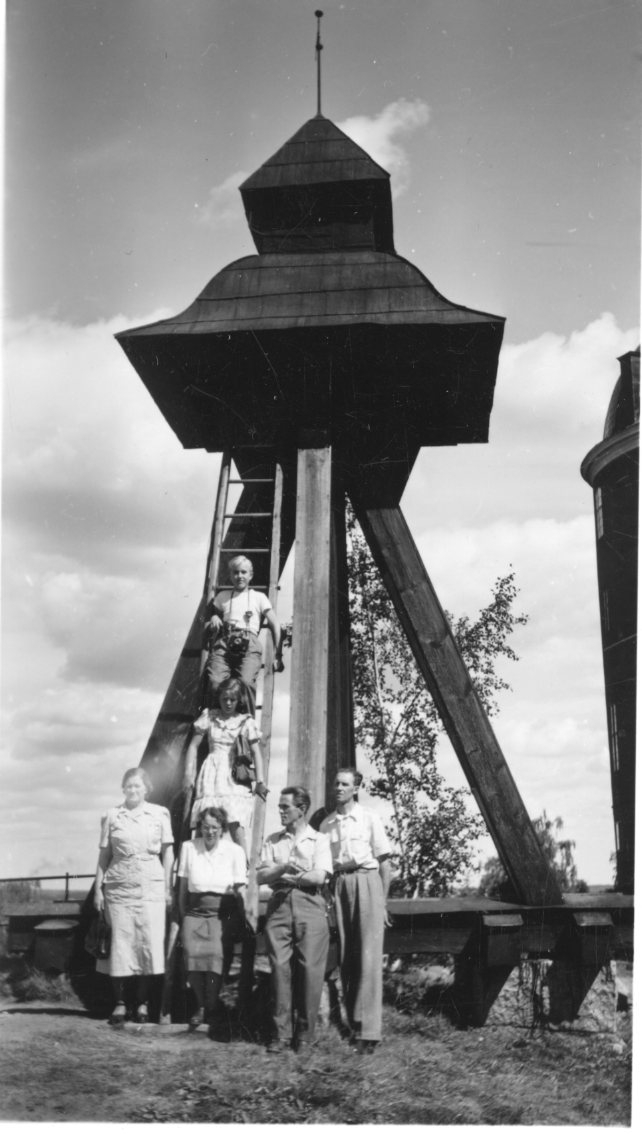 Ett sällskap barn och vuxna står vid en klockstapel.
