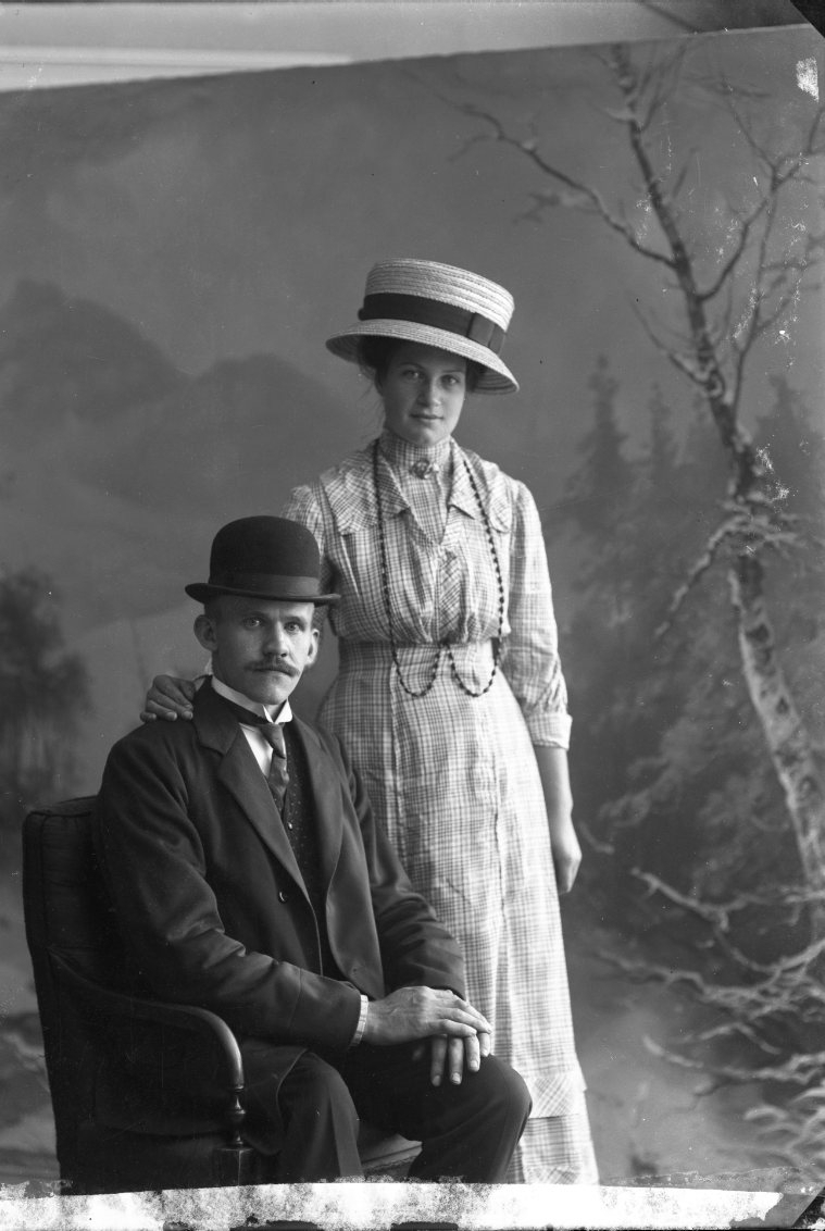 En ung kvinnna och man, bägge med hatt. Mannen sitter på en stol, hon står bredvid med höger hand på hans vänstra axel. Mannen är Axel Ström från Reaby, Gränna socken. Kvinnan är sannolikt hans hustru Ida Charlotta Bom.