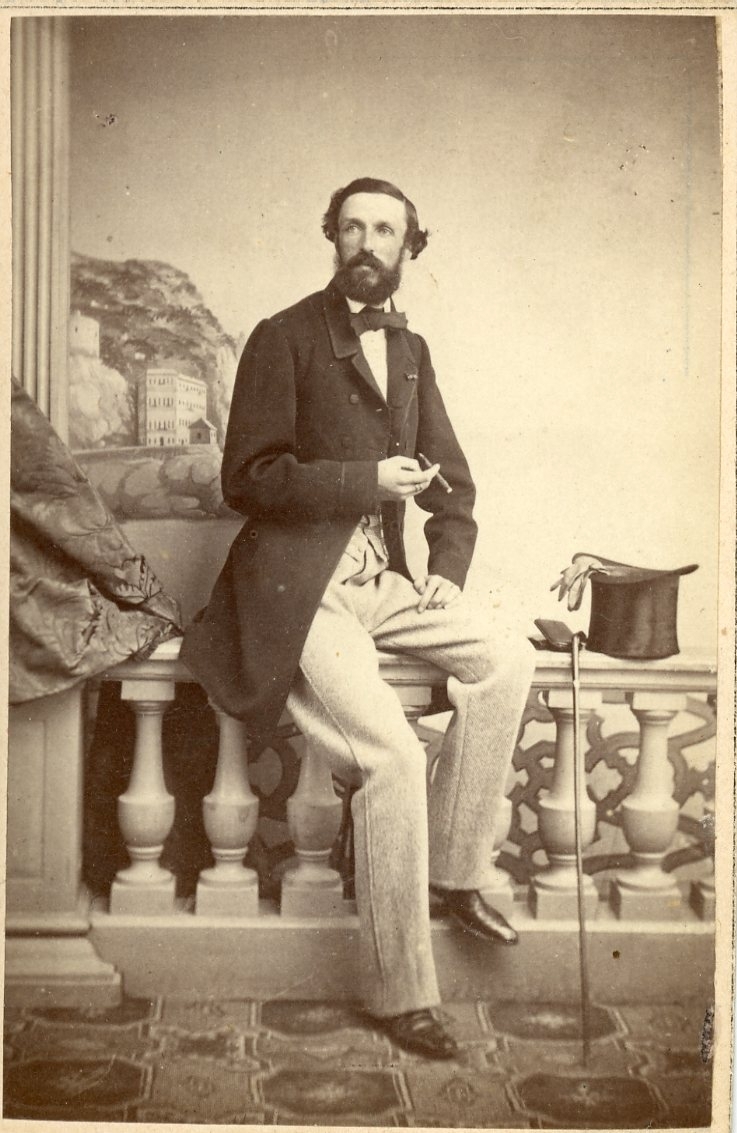 Kabinettsfotografi av en man som sitter på ett räcke i en ateljé. Han har en cigarr i höger hand. En hög hatt och en spatserkäpp intill honom.