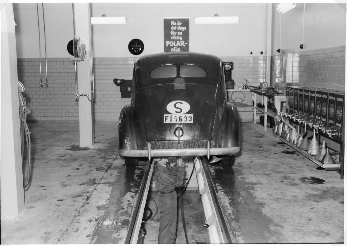 En man i overall står i en smörjgrop under en bil av okänt märke - registreringsnummer F14633.