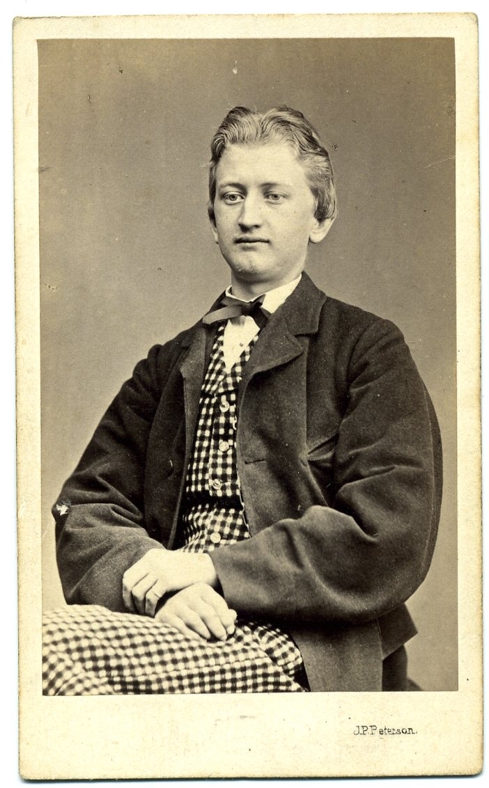 Kabinettsfotografi: bröstbild av en sittande ung man i rock över rutig väst och rutiga byxor.