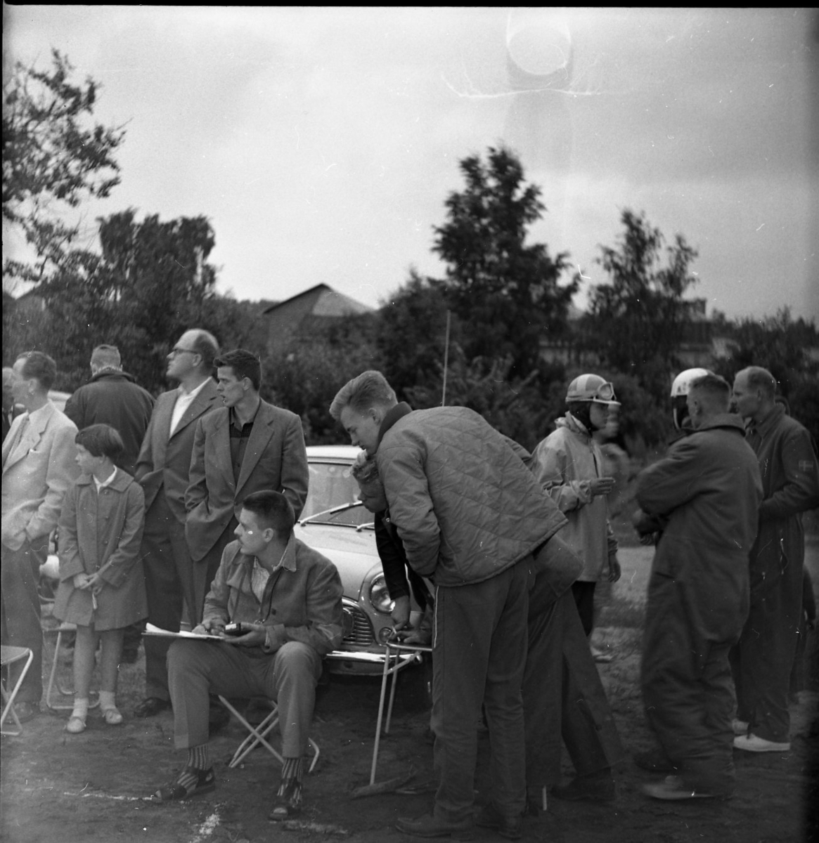 Bilden tagen vid sidan av en motorbana för vespor. Publik står och väntar på att förare på vespor ska passera. En sittande man håller på att antecka något på en skrivskiva. Han håller ett tidtagarur i handen.
