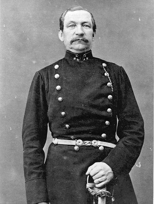 Porträtt av stående man med mustasch i militär uniform. Han håller vänster hand om värjfästet.