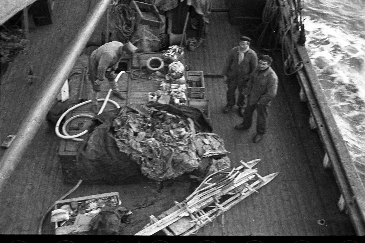Fynd från Vitön ombord på Isbjörn. P W Zapffe till vänster.