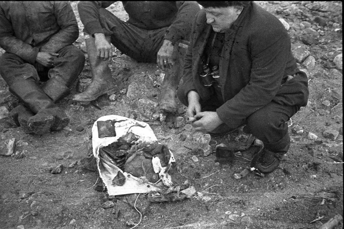 Besättningsmän från Isbjörn runt fynd på Vitön. Håkon Myhre till höger.