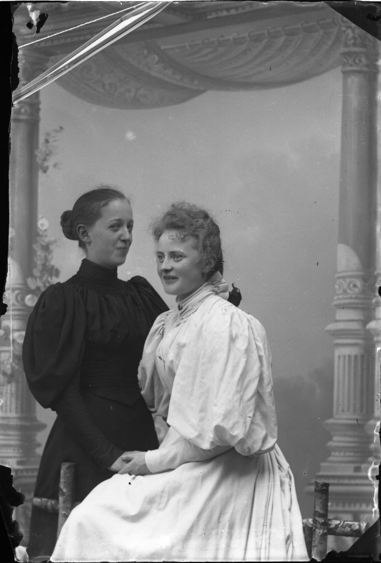 Två unga kvinnor intill varandra och som håller varandras hand, i mörk respektive ljus klänning. Kvinnan till höger Ester Grönberg.