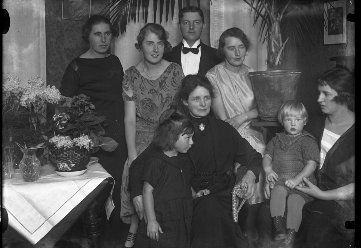 En äldre kvinna sitter omgiven av barn, barnbarn och sonhustru. Stående från vänster syskonen Kristina (Stina), Karin, Karl-Axel Rythén och Ann (Anna-Lisa) Rythén. Deras mamma Berta Rythén sitter med sondottern Birgit i knät och till höger sitter sonhustrun Ruth med sonen Åke i knät.