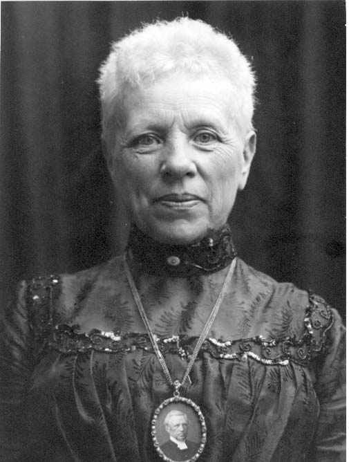 Bröstbild av prostinnan Holmberg. Hon bär ett halssmycke i form av ett mansporträtt i en oval ram - troligen hennes man, kyrkoherde Axel Alfred Holmberg.