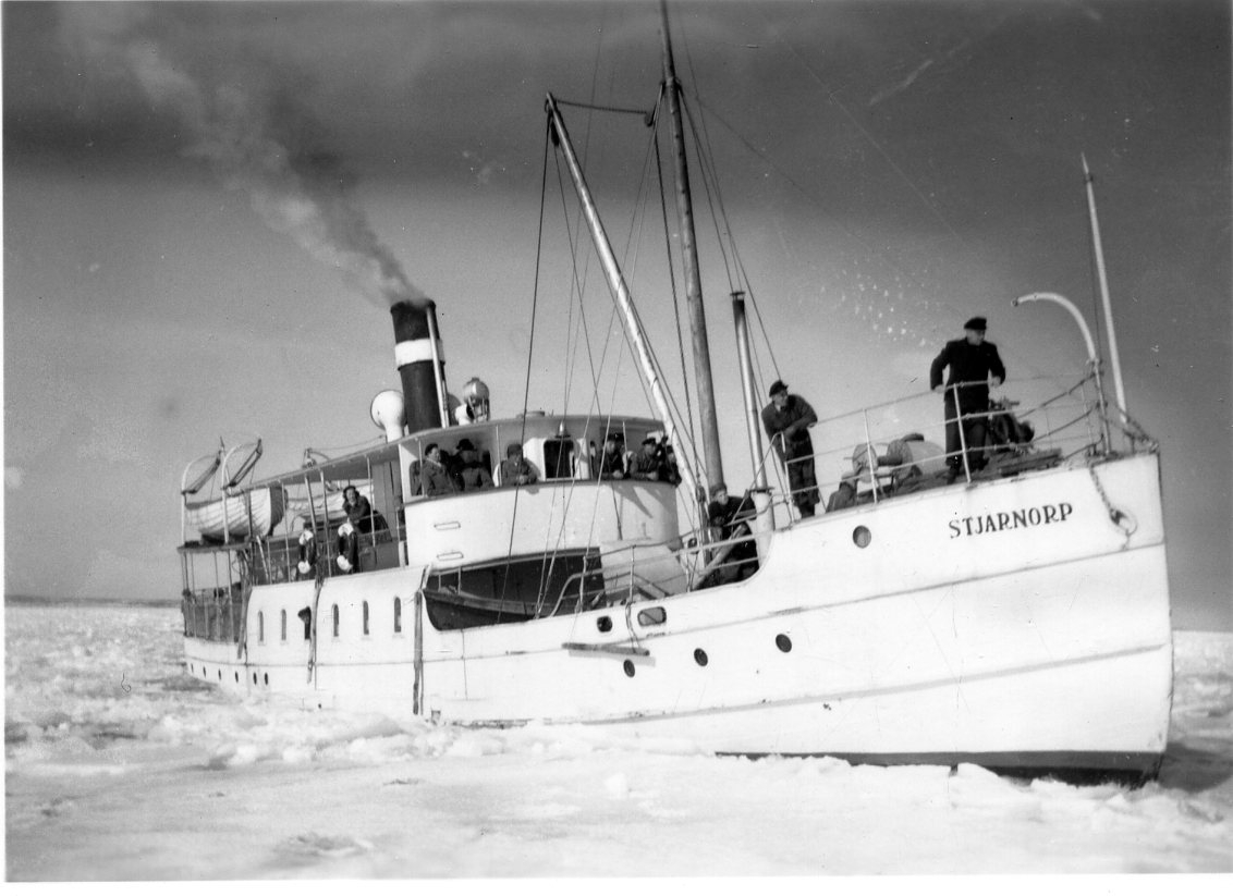 Motoriserade ångbåten M/S Stjärnorp går bland is på Vättern. Män står i fören och håller utkik.