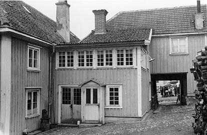 Gårdsmiljö från kv Hjorten 9 i Gränna. Foto mot torget, via portlider, där det är torghandel. Till höger skymtar höga staplar med långa vedträn.