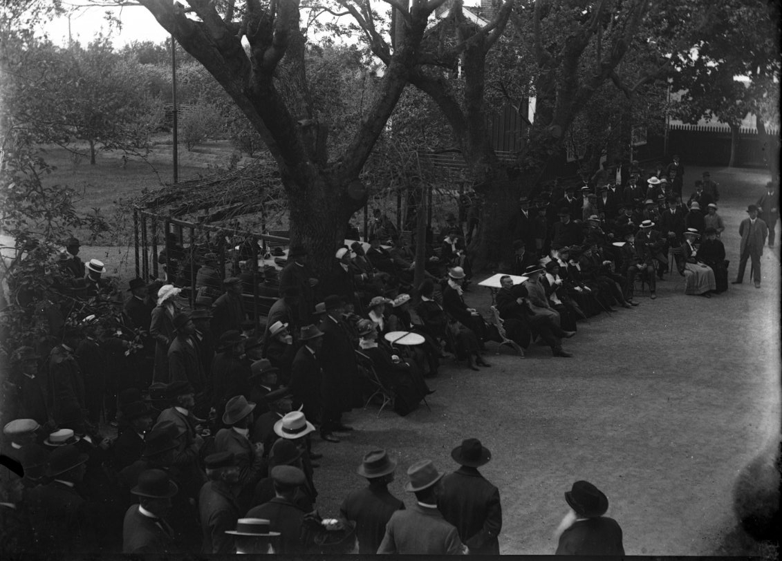 En stor folksamling med stående och sittande i Ribbagårdens trädgård, skuggade av höga träd. De är vända mot någon till höger som inte syns i bild, sannolikt föredragshållare och trädgårdsdirektör G Lind.