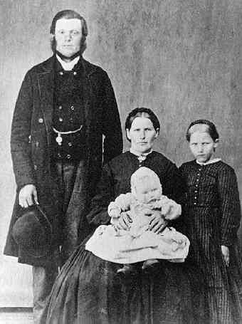 Gruppbild med familjen Gustav Johansson. Mannen står iklädd rock och väst med klockkedja. Han håller sin hatt i höger hand. Intill sitter hustrun med ett spädbarn i knät. En liten flicka i randig klänning står intill.