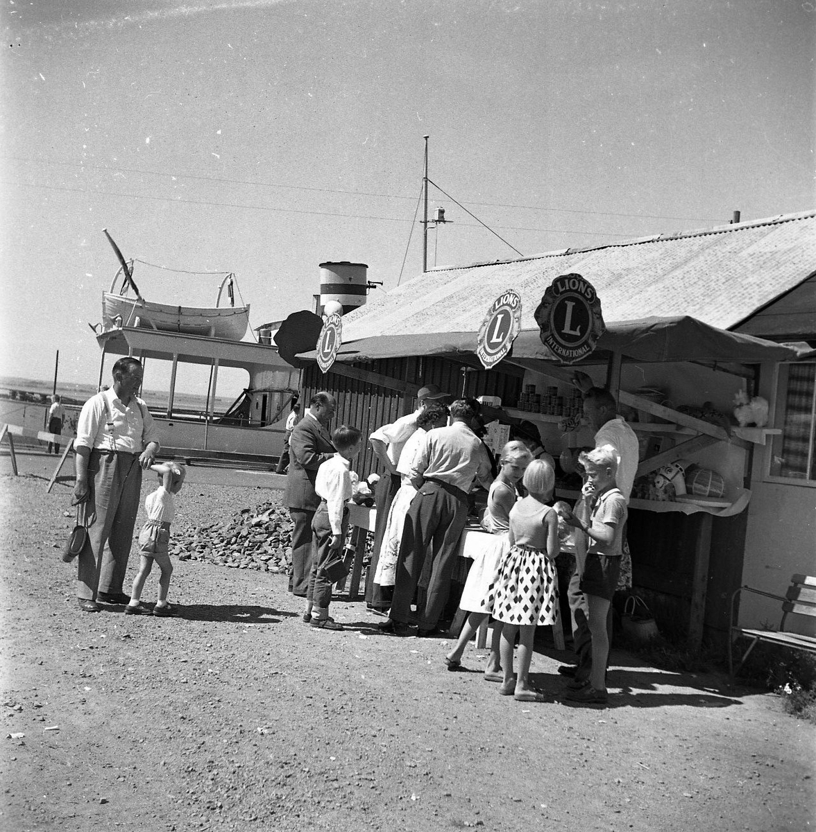 Barn och vuxna vid ett lottstånd i Gränna hamn. Lottståndet har en skylt för Lions. En färja ligger vid kaj i bakgrunden. Sannolikt marknad i Gränna Lions regi. En man håller en pojke i handen. Det är sommar och varmt.
