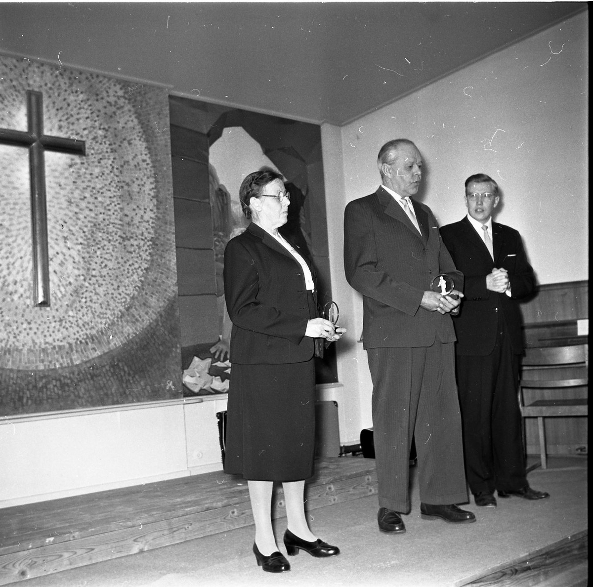 En kvinna och en man står på en scen. Mannen talar. De står med varsin stayett i händerna. En man står bredvid och ser på dem. Alla är finklädda. En kors hänger på väggen bakom dem.