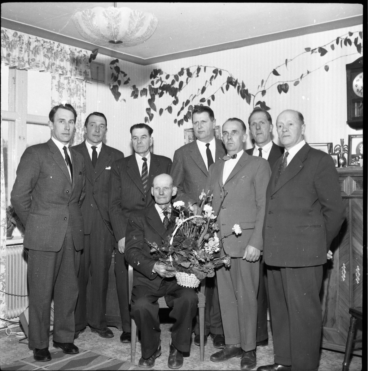 Några herrar står uppradade för fotografering. Bilden är tagen i samband med Skärstads handelsförenings årsmöte. På en stol i mitten sitter en av initiativtagarna till föreningen, Viktor Nilsson, med ett blomsterarrangemang i famnen. Stående från vänster till höger Lennart Hörnstein, John Eriksson (anställd i Handelsföreningen), Carl Bostig, Fredrik Ekman, Bertil Weimner, Johansson på Lund.
