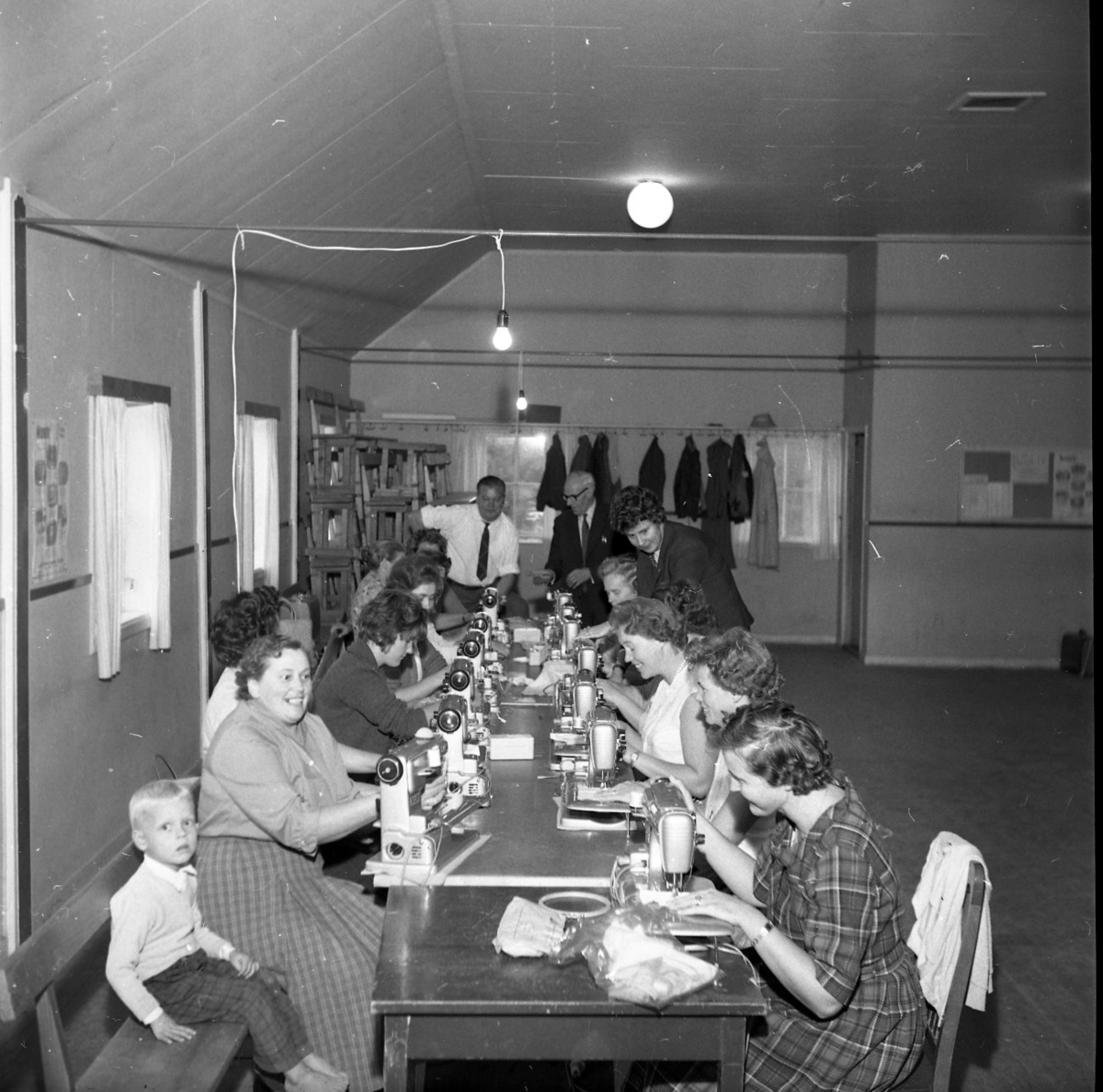 En grupp kvinnor sitter vid varsin symaskin längst med ett långbord. En pojke sitter vid änden vid bordet och tittar in i kameran. Två män står och tittar på kvinnorna när de syr.