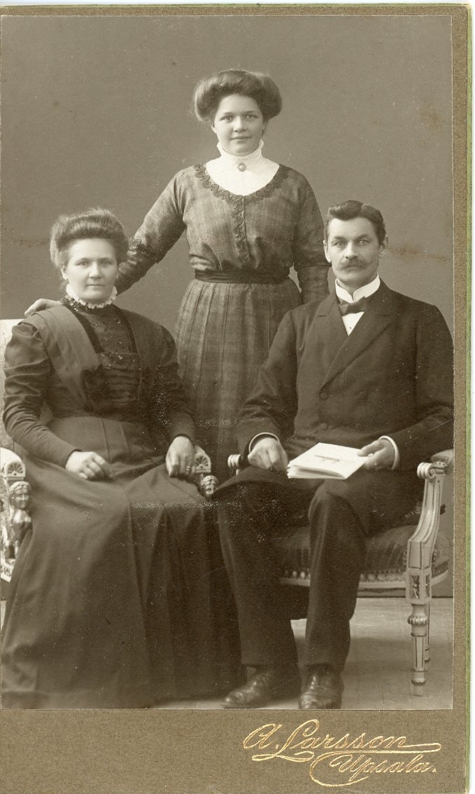 Kabinettsfotografi: en kvinna och en man sitter på varsin stol, en yngre kvinna står bakom/mellan dem.