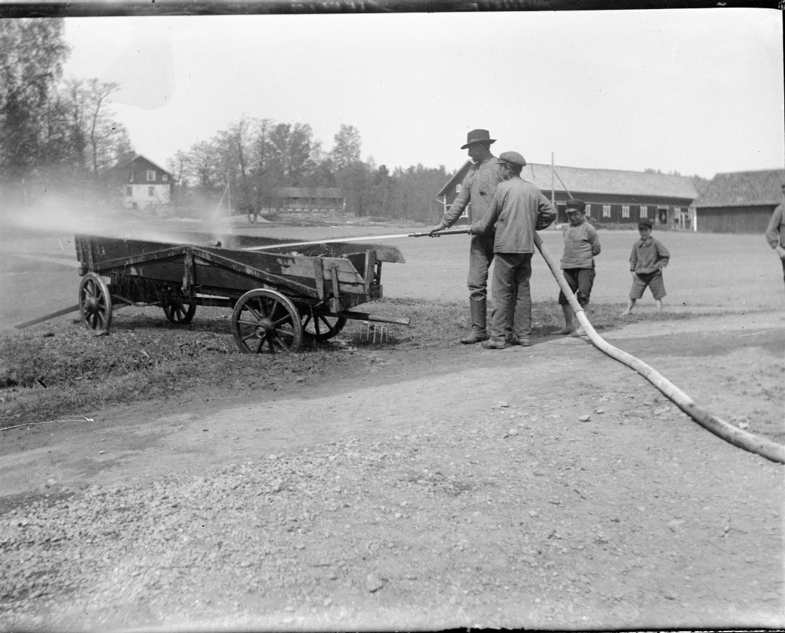 En man, med hjälp av några pojkar, spolar av en arbetsvagn - möjligen en gödselvagn.