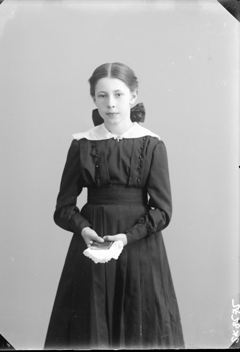 Porträtt av en flicka i mörk klänning och vit spetskrage. Hon håller en liten bok och näsduk i händerna. Sannolikt konfirmationsbild.