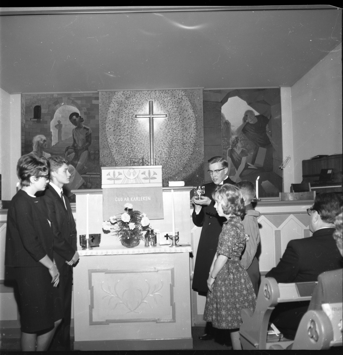 Missionskyrkan i Gränna. Från vänster: Gullvi Danielsson, Jan Wetter, pastor Karl Midnäs, troligen scouten Tommy Carlssono samt Ann-Marie Gustafsson. I handen håller Midnäs en brudkrona som syns på bild gm.ph82.1