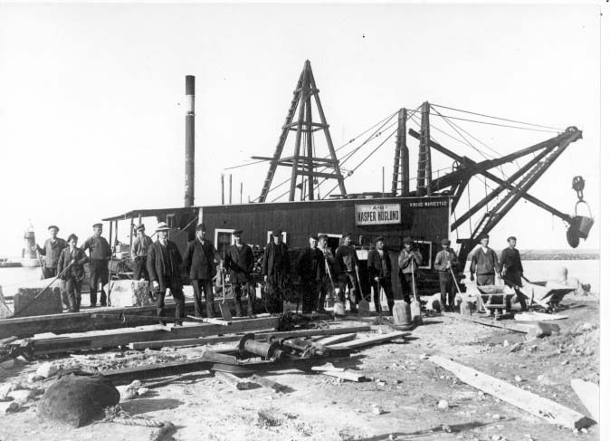 Ett 10-tal män i arbetskläder med skyfflar, skottkärror och stenblock framför ett mudderverk i Gränna hamn. På mudderverket sitter skyltar "A-B Kasper Höglund" samt "Viking : Mariestad".